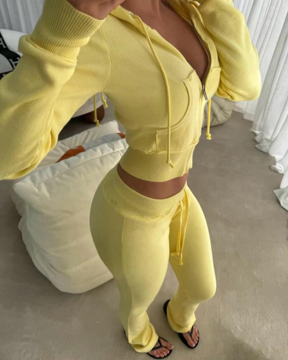 Design: The zip-up hooded sweatshirt includes a modern turn-down collar and functional drawstring ribbons for adjustable style. The flare pants add a fashionable touch, making this set both trendy and versatile.