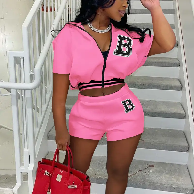 Casual 2 Two Piece Sets Outfits Women Zipper Short Sleeve Crop Top Skinny Biker Shorts Suits Pink Green Matching Sets